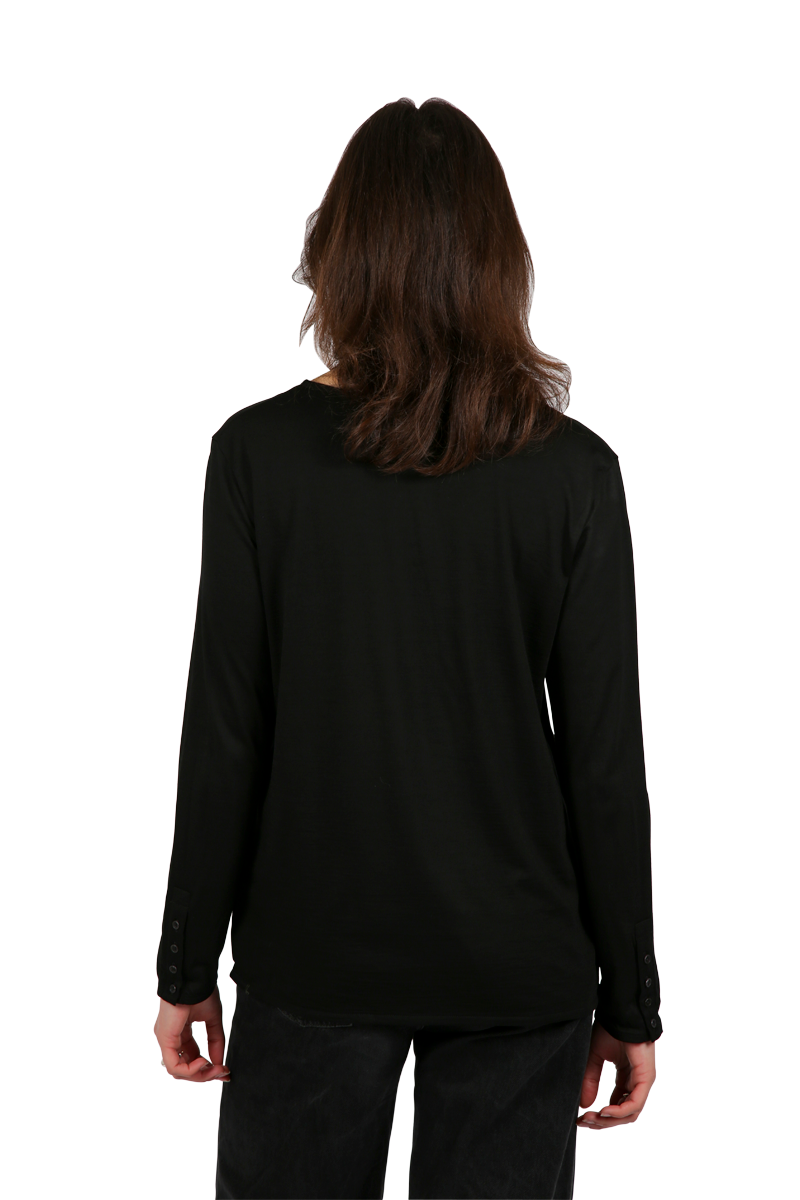 Ashley est un henley, ou tee-shirt à col tunisien, qui se distingue par des pattes de boutonnage profondes au col et aux manches, ornées de jolis boutons en nacre ton sur ton.